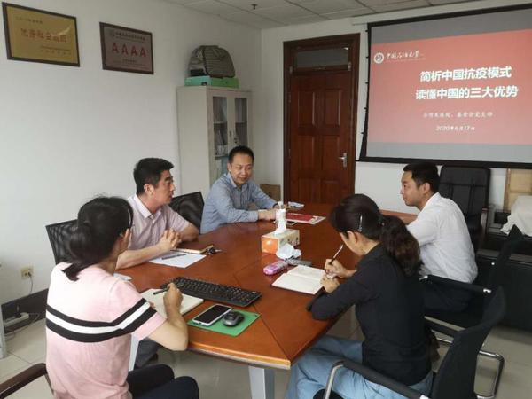 张炜同志结合学习王勇书记返校第一课的体会,在支部以“简析中国抗疫模式,读懂中国的三大优势”为题上党课。