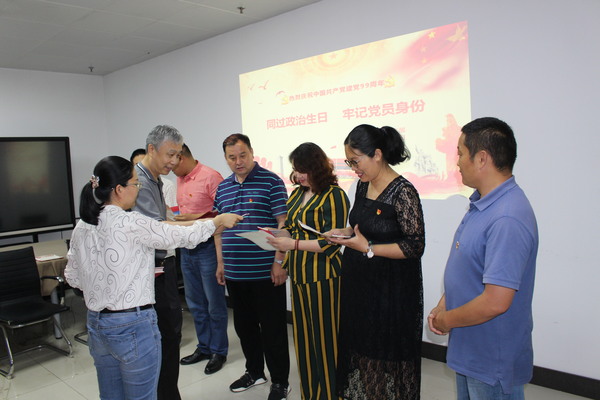 活动上,全体党员跟随习近平总书记的领誓一起重温入党誓词,每名党员再一次对党立下铮铮誓言,坚守“不忘初心、牢记使命”的郑重承诺,思想上再次受到“洗礼”。李子德对同过政治生日的六名同志表示祝贺,并为同志们发放贺卡、党章和购书卡。六名党员回忆了自己入党的情景,讲述了自己的成长历程和入党后的思想收获,并表示在今后的工作中以党员身份严格要求自己,发挥党员的模范带头作用。