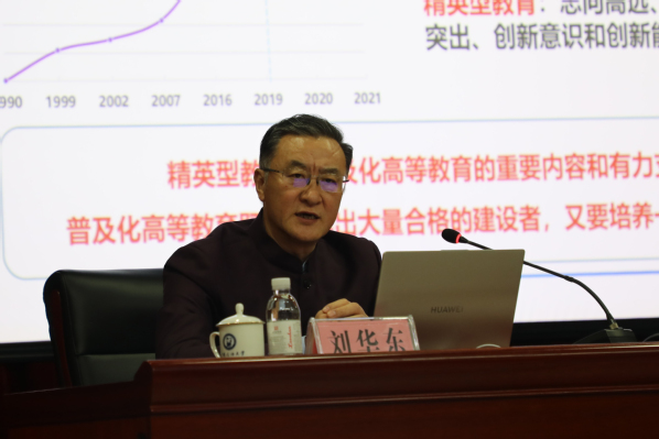 刘华东以“高等教育·高效管理的思考”为主题,从普及化高等教育与精英型教育培养的矛盾等8个维度深入浅出地剖析了当前高等教育面临的形势和挑战,从立校之本的重任、推石上山的难度、农业属性的艰辛、学子成才的期盼、社会关注的焦点等5个方面详细阐述了高校人才培养的压力和困境,重点强调了新时代背景下优秀教育管理者所肩负的责任使命和应该具备的基本素养。同时,结合近40年的工作经历,分享了自身许多宝贵的管理经验与成长感悟,并对在座的年轻干部寄予了厚望和期许。